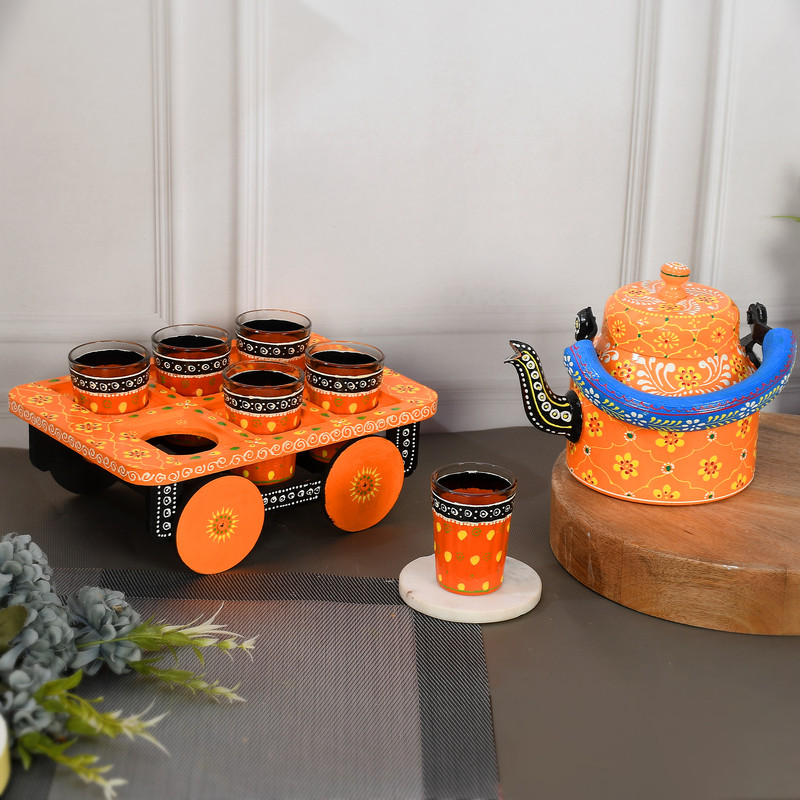HandPainted Alluminium Tea Kettle with 6 Glasses and Wooden Tray For Home Decor , Tea Party , Serving